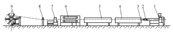 தற்போது, PVC மற்றும் PO குழாய்கள் உள்நாட்டிலும் சர்வதேச அளவிலும் அதிக அளவு தயாரிப்புகளாக உள்ளன.படம் 1பாலியோலின் (PO) குழாய்களுக்கான உற்பத்தி செயல்முறை ஓட்ட வரைபடத்தைக் காட்டுகிறது. ஒரு பைப் பாரிசனை வெளியேற்றி, ஒரே மாதிரியான பிளாஸ்டிசைஸ் செய்யப்பட்ட உருகலாக, திருகு மூலம் வருடாந்திர இடைவெளி டையில் (2) பிளாஸ்டிக் செலுத்தப்படுகிறது. இது உடனடியாக அளவுத்திருத்த அலகு (3) குளிரூட்டல் மற்றும் அளவிடுதல் ஆகியவற்றிற்குள் நுழைகிறது, பின்னர் குளிரூட்டும் தொட்டியில் (4) போதுமான குளிரூட்டலுக்கு உட்படுகிறது. குழாய் சரிசெய்யக்கூடிய ஒரு நிலையான வேகத்தில் வெளியே இழுக்கப்படுகிறதுஇழுத்துச் செல்லும் அலகு(6), இறுதியாக கட்டர் (7) மூலம் குறிப்பிட்ட நீளத்திற்கு வெட்டவும். 160மிமீக்கும் குறைவான விட்டம் கொண்ட மெல்லிய சுவர் குழாய்களை விண்டரால் சுருட்டலாம் (9).