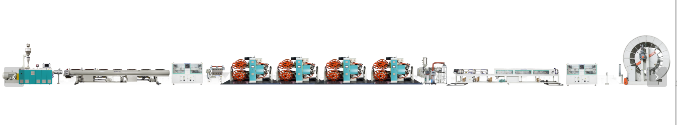 வலுவூட்டப்பட்ட தெர்மோபிளாஸ்டிக் குழாய் (RTP) எக்ஸ்ட்ரூஷன் லைன்மூன்று பகுதிகளைக் கொண்டுள்ளது. முதல் பகுதி உள் பிளாஸ்டிக் குழாய் வெளியேற்ற உபகரணங்கள் அலகு; இரண்டாவது பகுதி இடைநிலை அடுக்கு அல்லாத உலோக கம்பி வலுவூட்டப்பட்ட முறுக்கு உபகரணங்கள் அலகு; மூன்றாவது பகுதி வெளிHDPE பூச்சு வெளியேற்ற உபகரணங்கள் அலகு. இது அதிக செயல்திறன், அதிக வேகம், அதிக ஆட்டோமேஷன் மற்றும் ஆற்றல் சேமிப்பு ஆகியவற்றின் நன்மைகளைக் கொண்டுள்ளது. RTP கலப்பு குழாய் தயாரிப்பதற்கு இது ஒரு சிறந்த கருவியாகும்.